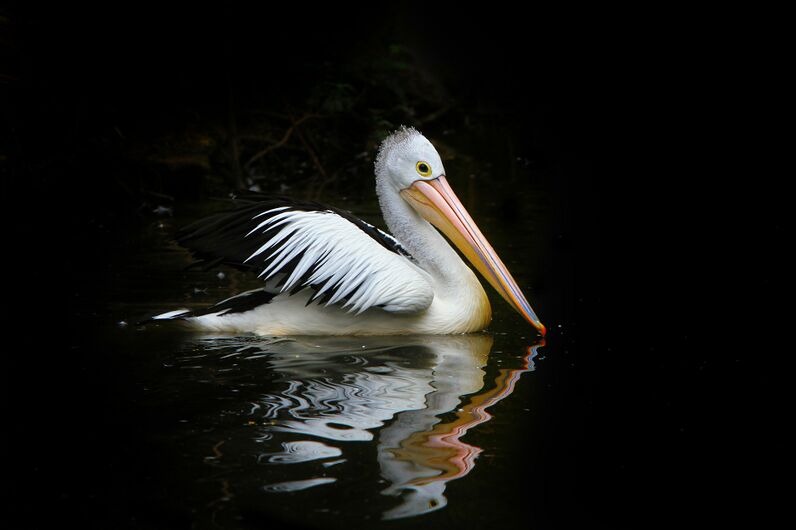 "Définition(s)" oiseau aquatique, qui a des pieds palmés et un long bec, où il peut mettre en réserve des aliments pour lui et ses petits